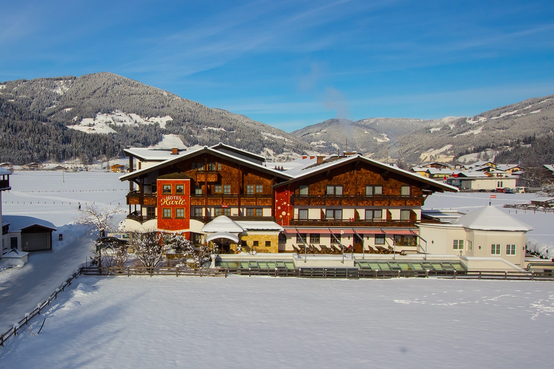 Het hotel bevindt zich op slechts 200 m van de gondel ‘Achterjet’. Een extra troef is dat het hotel een gratis, verwarmde skidepot ter beschikking stelt voor de hotelgasten aan de gondel. Salzburger Sportwelt bestaat uit een aaneenschakeling van de acht bekendste skigebieden van de regio rond Salzburg. De enorme skicarrousel rond de skistations Flachau, Wagrain-Kleinarl, St.Johann-Alpendorf, Radstadt, Altenmarkt-Zauchensee, Eben en Filzmoos vormt de kern van het uitgebreide skigebied ‘Salzburger Sportwelt’.
